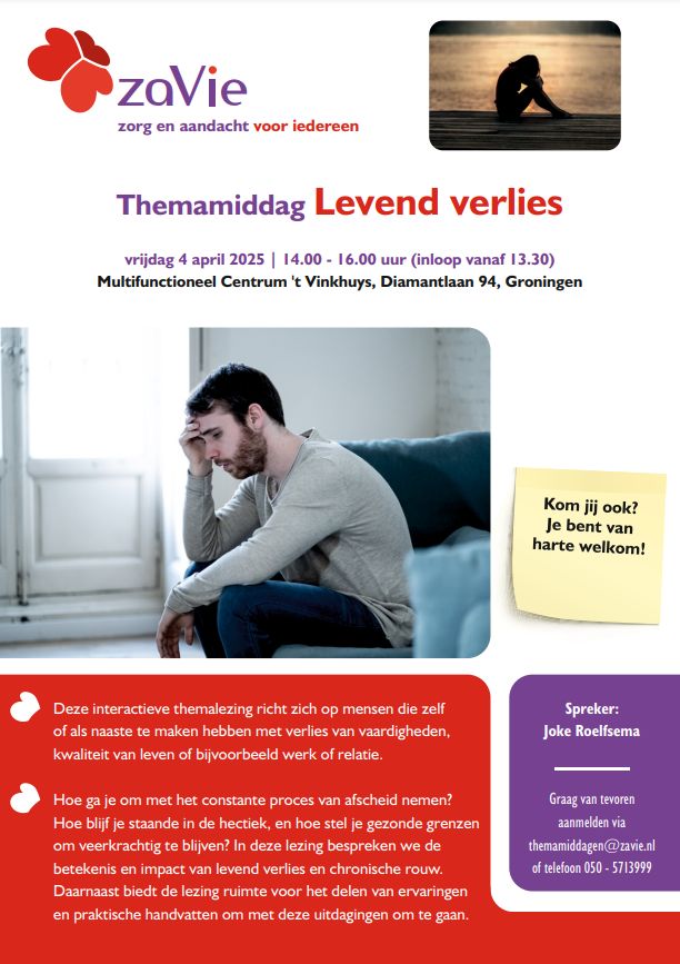 Iedereen krijgt in het leven te maken met verlies en rouw. Bijvoorbeeld door het overlijden van een dierbare. Maar ook een scheiding van een partner, een afnemende gezondheid of verlies van een baan, kunnen leiden tot – een soms jarenlang – proces van rouw. Hoe pak je dan de draad weer op, vind je een nieuwe balans en krijg je weer zin in je leven? Daarover ging de Themamiddag Levend Verlies in ’t Vinkhuys in Groningen op vrijdag 4 april.